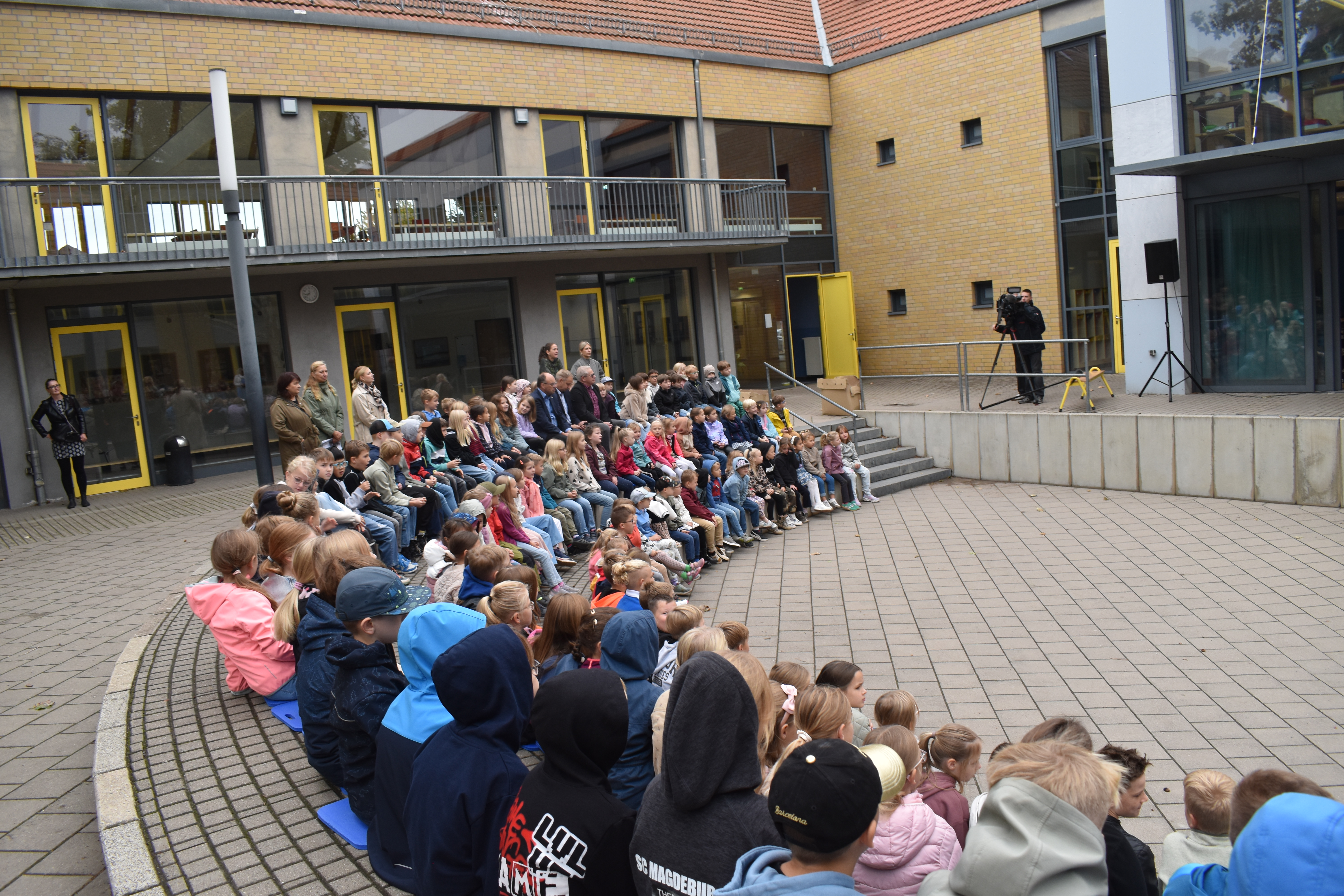 Im September 2023 begab sich die Klasse 4a gemeinsam mit ihrer Klassenlehrerin Frau Andree und ihrer Hortnerin Frau Hartmann auf eine Zeitreise ins Mittelalter. Die Megedeborch öffnete mit einem lauten „Gott zum Gruße“ ihre Tore und aus den Schülern der Grundschule wurden Mägde und Lehrlinge.