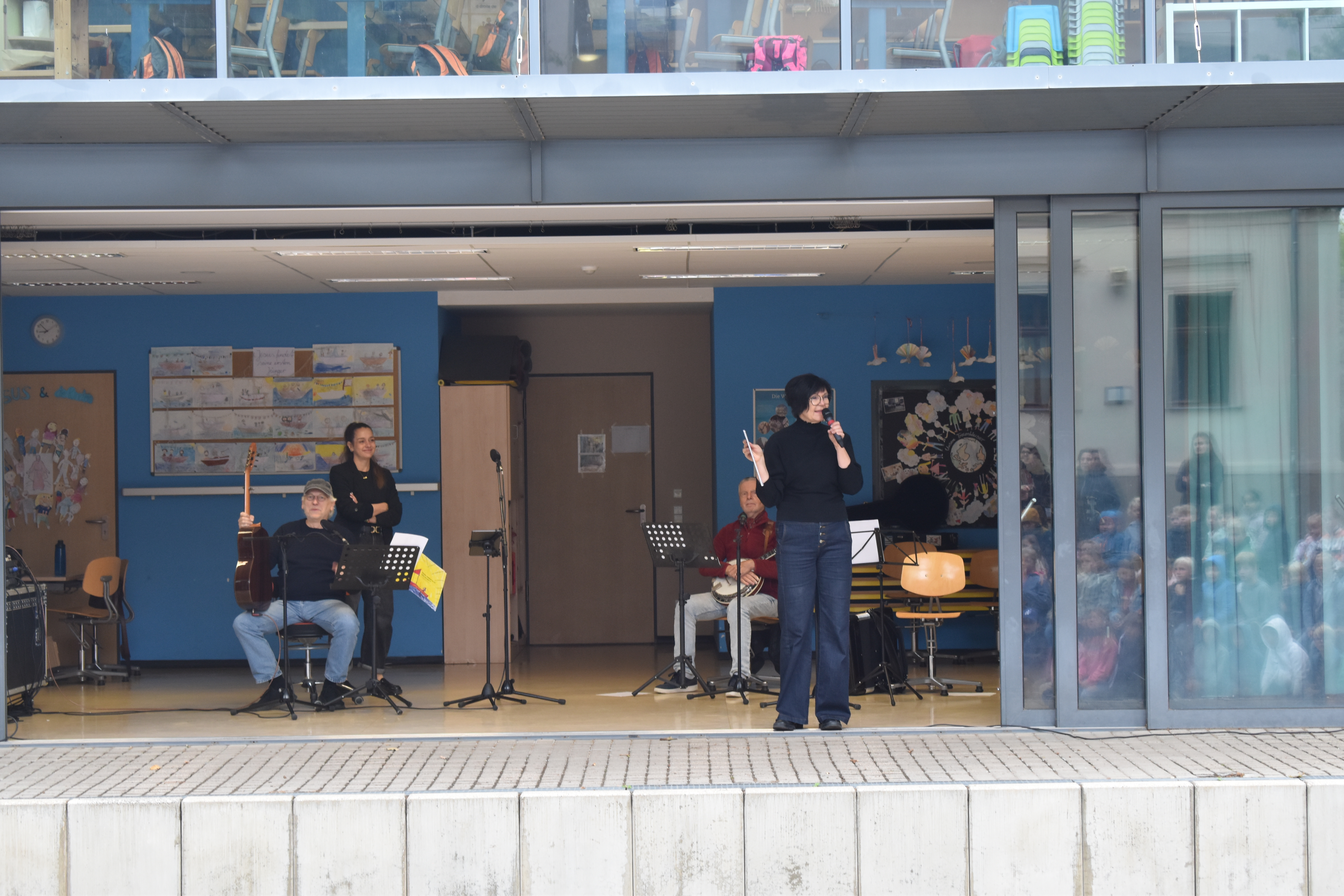 Die gesamte Grundschule beendete die Projektwoche mit dem traditionellen Treppensingen im Foyer.