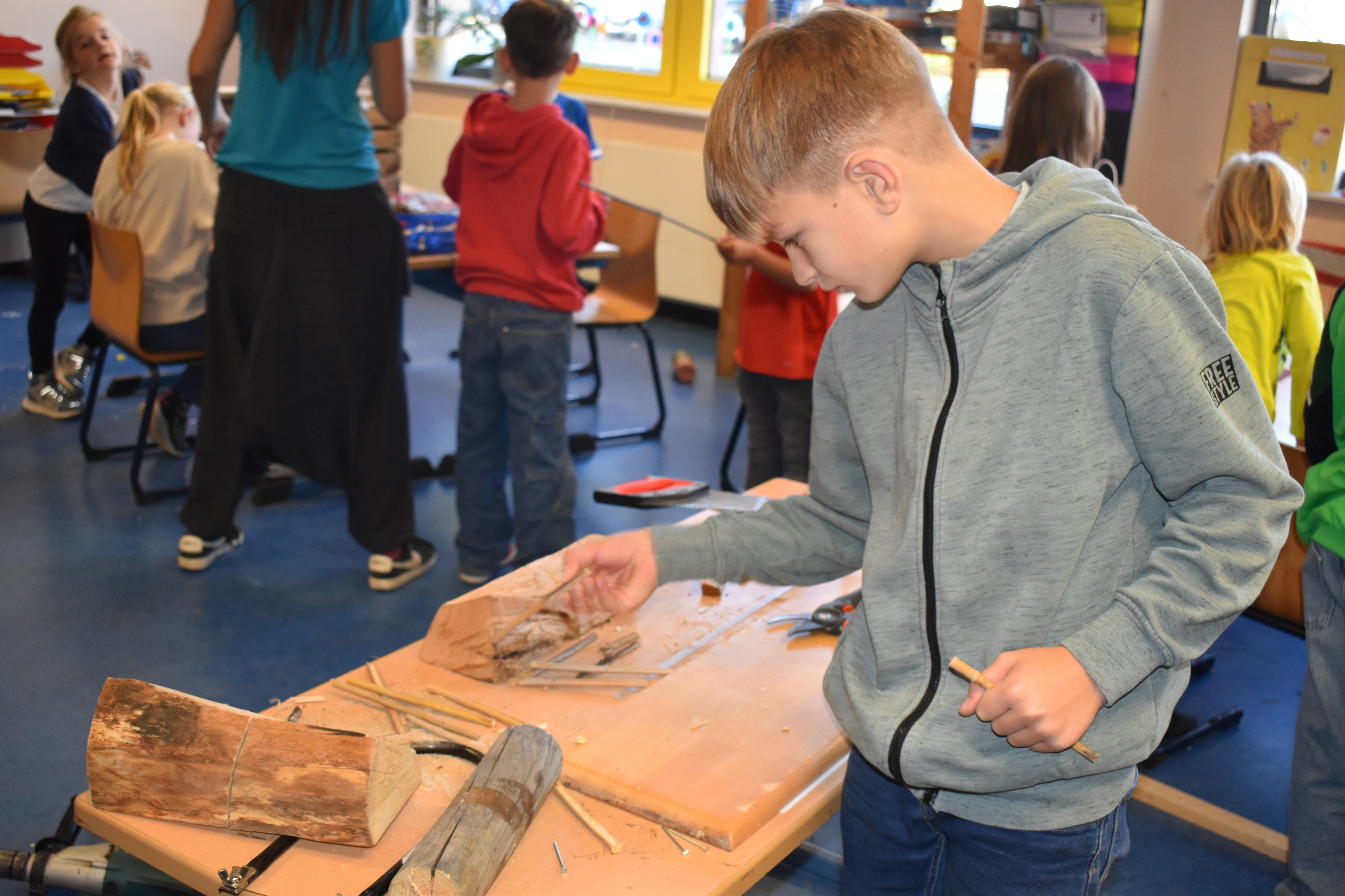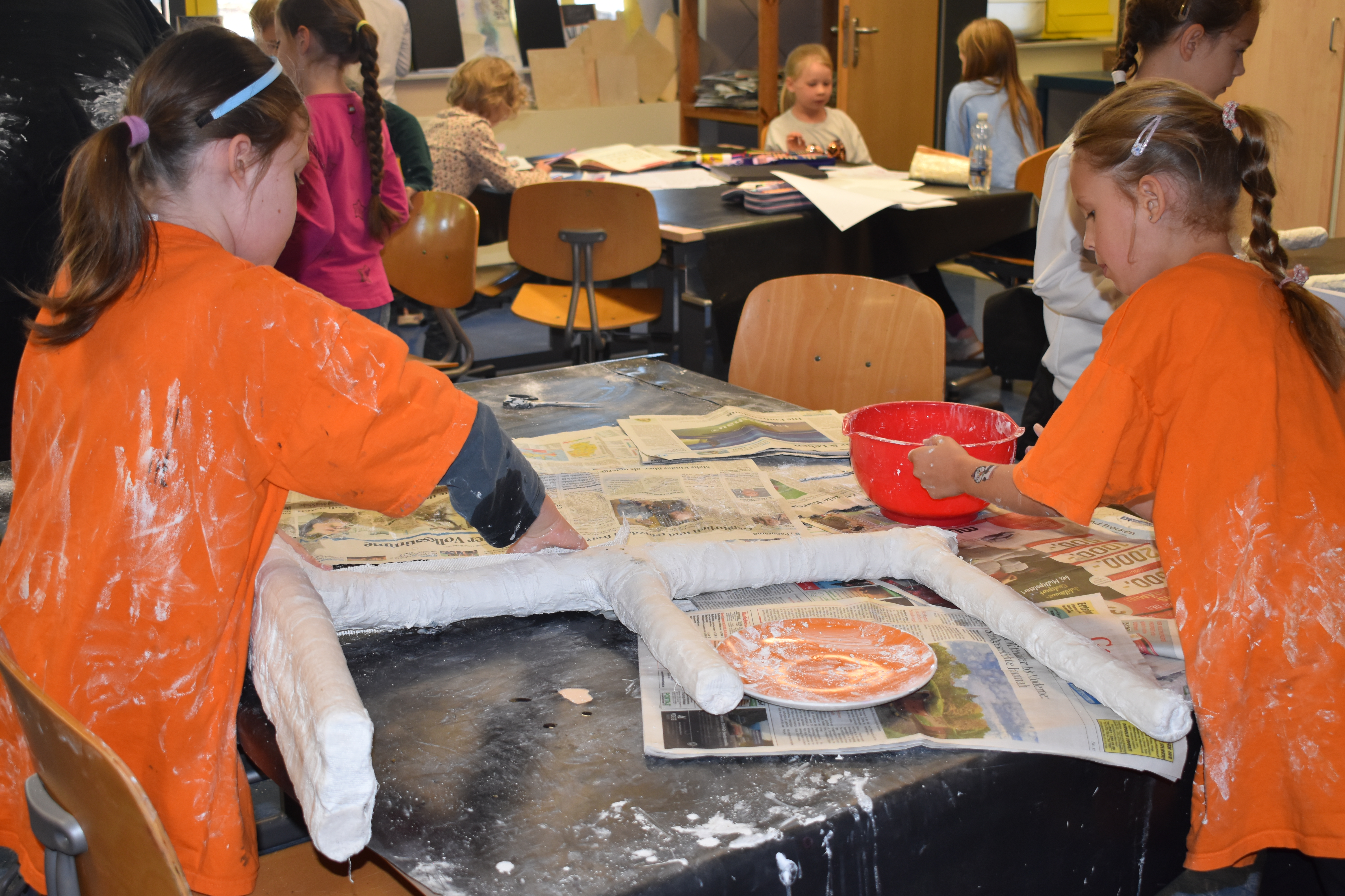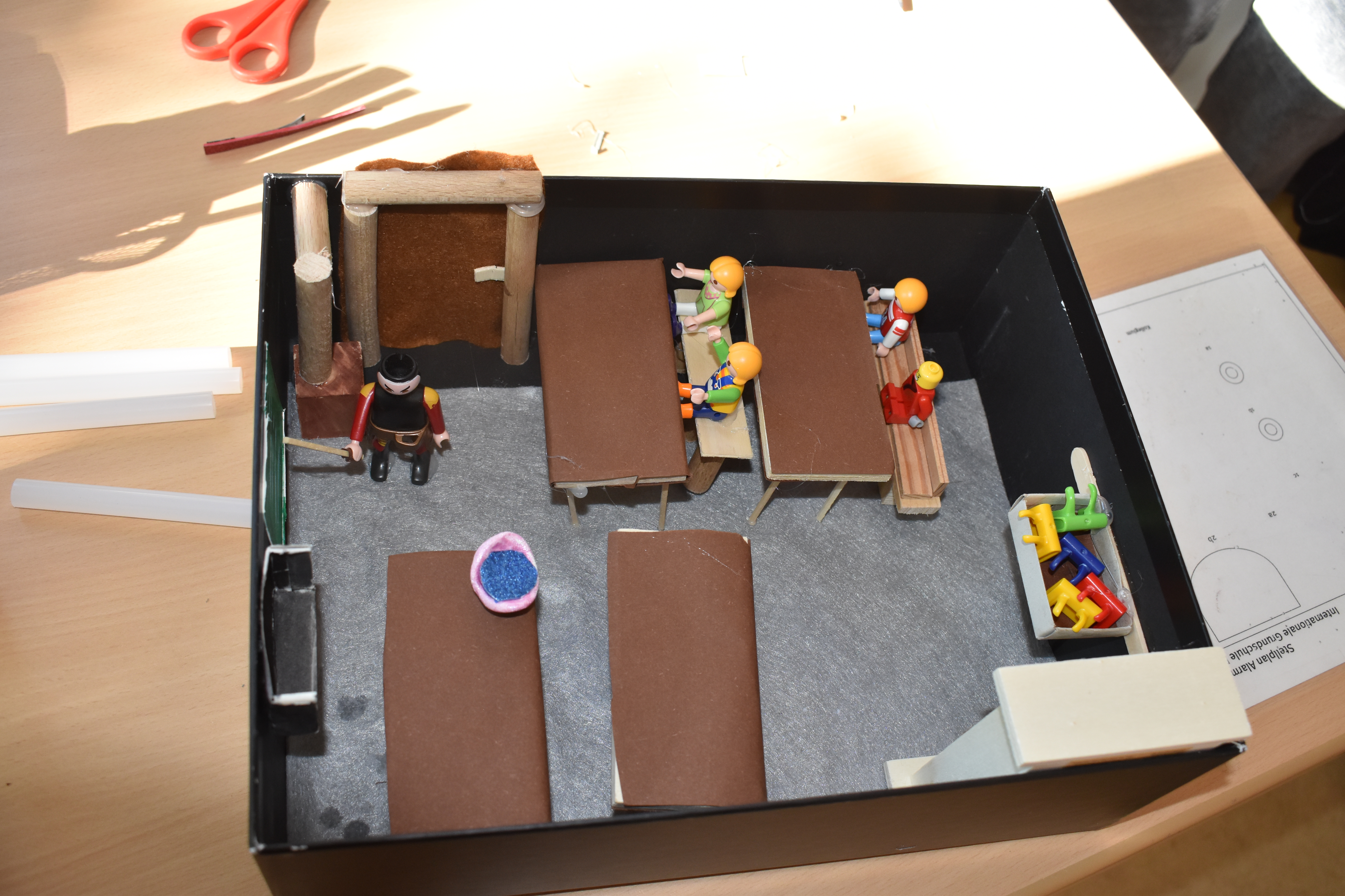 Mit neuen, alten Namen bestückt, wählte jeder sein mittelalterliches Handwerk. Die Tischer hobelten, die Töpfer erschufen neue künstlerische Werke aus Ton, die Korbbinder flochten aus Naturmaterialien und die Weber kreierten Armbänder. Zum Mittag gab es eine deftige Suppe, für die unsere Lehrlinge im Wirtshaus fleißig Möhren schnippelten, während in der Backstube der Apfelkuchen zubereitet wurde. Die Stadtwache bewachte die Tore und nur mit der Parole kamen die Händler in die Megedeborch hinein und wieder hinaus.