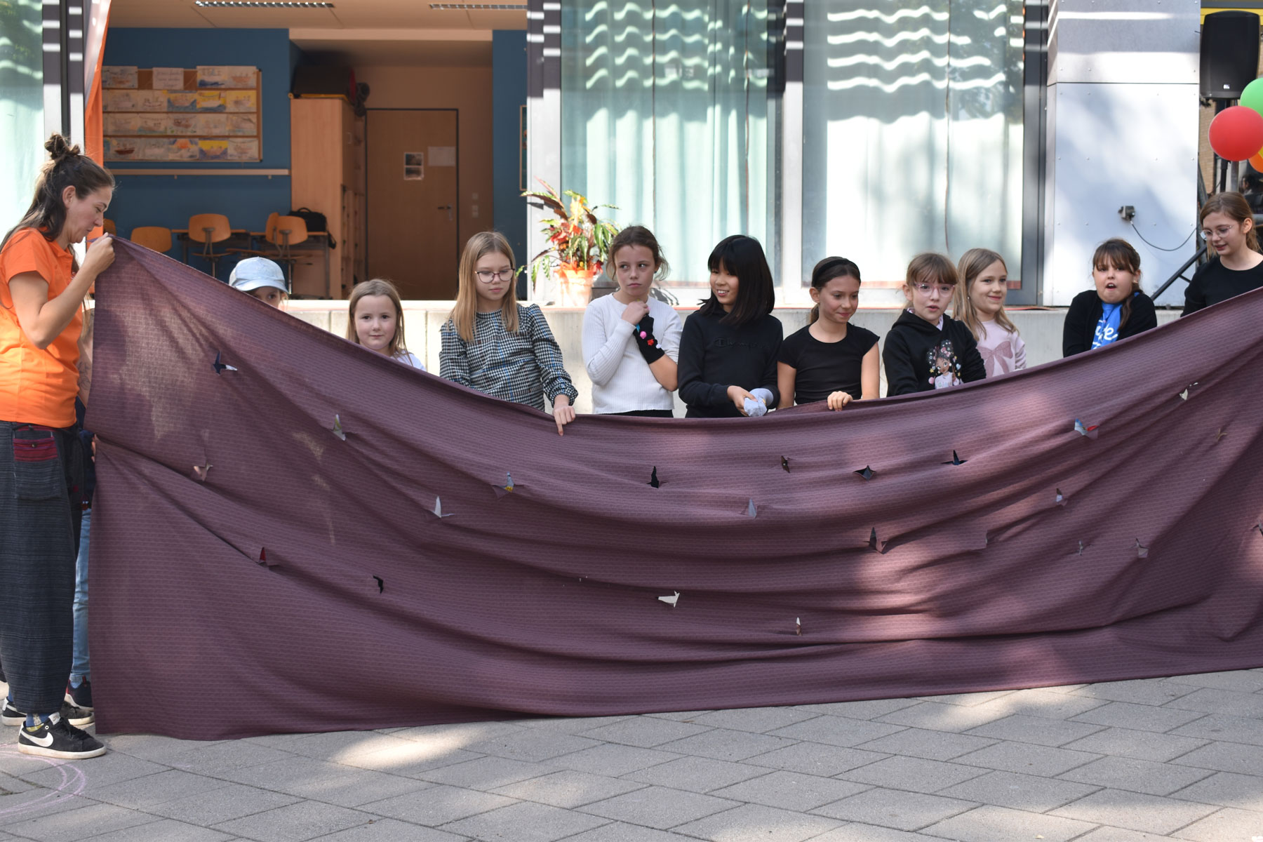 Die Klasse 1a bekam kurzzeitig Zuwachs in Form von Schmetterlingsraupen. Begeistert verfolgten die Schülerinnen und Schüler, wie die Raupen jeden Tag größer wurden, ehe sie sich verpuppten. Schon nach einer weiteren Woche schlüpften die wunderschönen Distelfalter. Interessiert beobachteten die Kinder, wie die Schmetterlinge Fruchtzucker mit ihrem Saugrüssel aufsaugten. Doch schon war es wieder Zeit, Abschied zu nehmen und gemeinsam ließen sie die Schmetterlinge auf dem Schulhof in die Freiheit fliegen.